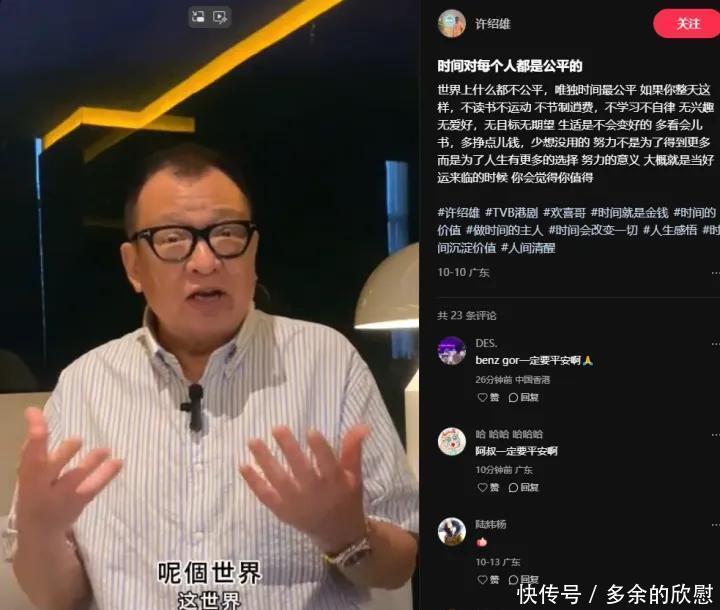 曾与许绍雄合作过《绝代商骄》《使徒行者》等作品的佘诗曼,27日在澳门出席活动时被问及此事,当场忍不住落泪。她表示自己早已知晓对方身体状况出现问题,也一直在协助处理相关事宜,并已亲自前往探望。但她强调不方便透露具体情况,需要等待对方家人来说明。她还透露原本计划前往北京宣传,现在将先返香港探望对方。作为TVB资深“绿叶”演员之一,许绍雄入行超过半个世纪,一直都有着非常好的观众缘,拥有“欢喜哥”等诸多经典角色,是非常成功的“老TVB人”。橙柿互动记者搜索到,许绍日还活跃在社交平台。